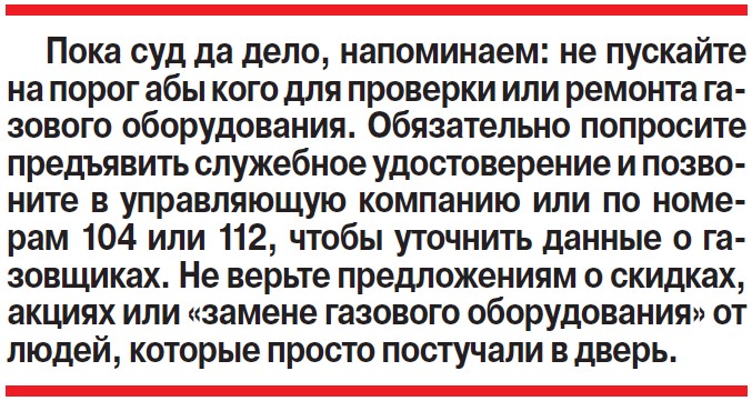 По данным следствия, они представлялись сотрудниками ООО «Межрегионгаз Сервис». Такая компания когда-то была зарегистрирована в Омске, но, после того как ее руководителей осудили за мошенничество, закрылась. Уходя из компании, слесарь Евгений Кавун забрал с собой бланки, печать с поддельной подписью директора и решил самостоятельно продолжить мошенническое дело. Он позвал в напарники Ирину Урбах, которая трудилась контролером в закрывшейся фирме. Эти двое, одетые в униформу, схожую с формой работников официальных газовых служб, ходили по квартирам, предъявляли поддельные удостоверения и после поверхностного осмотра оборудования неизменно сообщали о его неисправности, а потом запугивали штрафами и возможным взрывом газа в случае отказа приобрести и установить предлагаемые ими гибкие подводки и запорную арматуру.