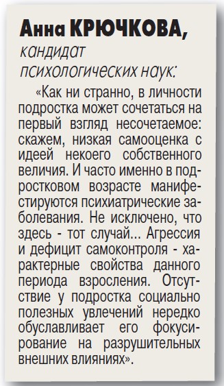 Так что более закономерен вопрос к родителям убийцы: неужели поведенческие предпосылки «неладного» не были очевидны? Неужели у близких не вызывало подозрения многочасовое зависание Тимофея в Сети, не встревожило приобретение им одежды с экстремистскими логотипами? Разве они не замечали, чем вдохновляется их сын, как меняется его поведение?