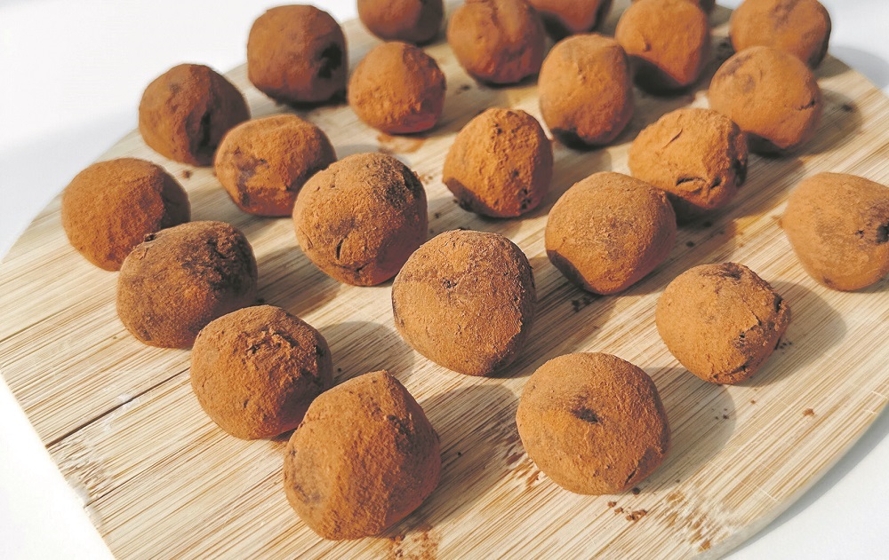 Обвалять в кэробе (какао), украсить растопленным шоколадом;