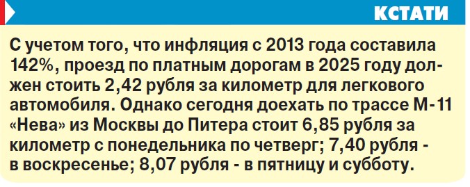 С учетом того, что инфляция с 2013 года составила 142%, проезд по платным дорогам в 2025 году должен стоить 2,42 рубля за километр для легкового автомобиля. Однако сегодня доехать по трассе М-11 «Нева» из Москвы до Питера стоит 6,85 рубля за километр с понедельника по четверг; 7,4 рубля - в воскресенье; 8,07 рубля - в пятницу и субботу.