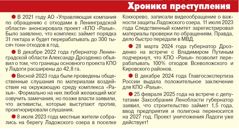Что это, оголтелая жадность и вседозволенность или спланированная диверсия и провокация? Ведь в результате деятельности КПО «Рахья» и, как следствие, загрязнения Ладоги лишатся питьевой воды весь Санкт-Петербург и окрестности! Просим соответствующие органы провести проверку и остановить этот беспредел.