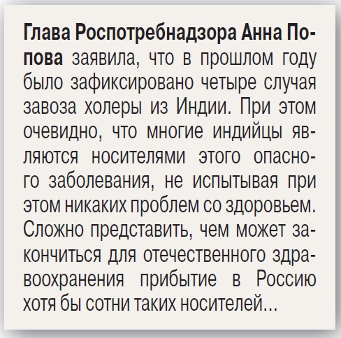 «Наши чиновники фактически готовы «культурно обогащать» РФ специфическими рисками, характерными для отдельных сельских регионов Индии, - считает Делягин и перечисляет несколько факторов, вызывающих особую тревогу: - Во-первых, Индия, согласно данным фонда Thomson Reuters, самая опасная для женщин страна в мире. Здесь изнасилования, в том числе массовые, - обыденность. Кто даст гарантии, что этот вид преступлений не перекочует за кордон? Во-вторых, Индия сталкивается с широким спектром тропических болезней. Люди, выросшие в тех условиях, зачастую переносят инфекции бессимптомно, тогда как иммунитет россиян с ними незнаком. Ну и прибавьте к этому привычки, сформированные специфической социальной средой…»