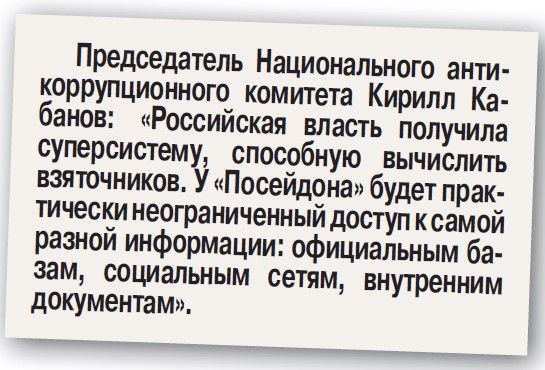 «Российская власть получила суперсистему, способную вычислить взяточников. У «Посейдона» будет практически неограниченный доступ к самой разной информации: официальным базам, социальным сетям, внутренним документам. Искусственный интеллект должен искать все пересечения и совпадения. Допустим, есть какой-то чиновник. Он каждый год подает декларацию о доходах. Официально у него почти ничего нет. Неофициально дома, машины, бизнес записаны на друзей, жену, подставных лиц. «Посейдон», анализируя сведения из реестров собственности, изучая фотографии в соцсетях, родственные связи, ищет совпадения. Компьютер смотрит, где и сколько денег потратил наш чиновник. Так можно выявить нестыковки в доходах и расходах. Конечно, машина не готова заменить полноценную розыскную работу, но она упрощает задачу, прочесывая доступные ей ресурсы», - рассказал председатель Национального антикоррупционного комитета Кирилл Кабанов. Он считает, что система будет работать в первую очередь против высокопоставленных чиновников. «Государство интересуют крупные коррупционеры. Информация попадет сначала в ФСО, потом в Управление президента по вопросам противодействия коррупции. Администрация Путина не зря указана координатором проекта», - заявил Кабанов.