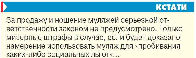 Поистине возмутительно, что за продажу и ношение бесчестными гражданами таких муляжей никакой серьезной ответственности действующим законом не предусмотрено. Только мизерные штрафы, да и то лишь в том случае, если будет доказано намерение сего ряженого использовать муляж для «пробивания каких-либо социальных льгот»… Именно наличием вопиющих пробелов в законодательстве объясняется тот факт, почему нахальные псевдогерои не боятся устраивать свой постыдный маскарад.