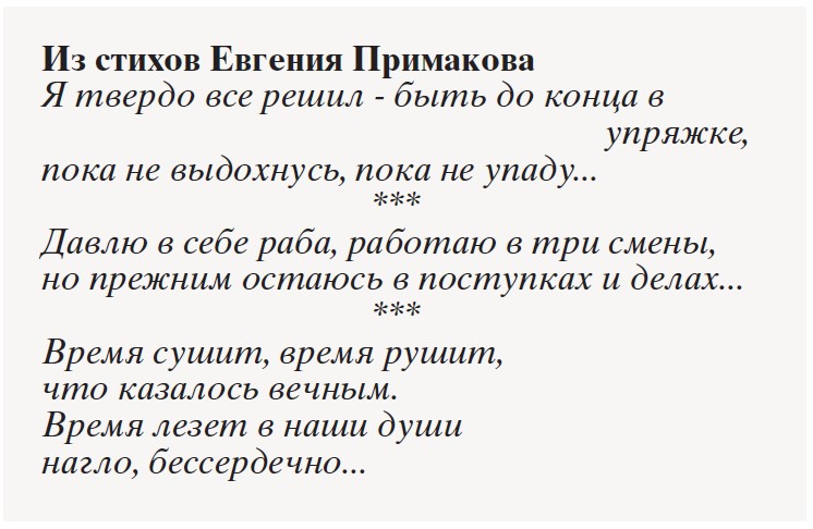 - Не могу вспомнить, чтобы я видел его раздраженным, - рассказывал мне десять лет назад друживший с Примаковым мэр Москвы Юрий Лужков, ныне уже тоже, к сожалению, покойный. - Всегда расположен к собеседнику, всегда улыбался. Очень светлый человек. А его юмор, его литературные способности... Он ведь писал прекрасные стихи, некоторые положены на музыку. Был прекрасным тамадой, знал миллион анекдотов, удивительно вписывающихся в обсуждаемую за столом тему.