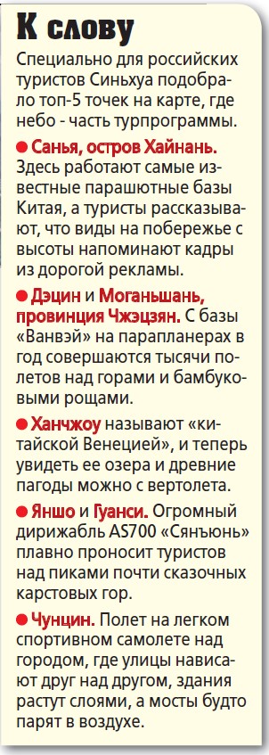 Подобные эмоции в Китае переживают тысячи людей ежедневно, а про ситифлай туристы узнали бы еще не скоро, если бы не стремительное развитие в стране низковысотной авиации. В Поднебесной появляются парапланерные базы, вертолетные станции, даже целые «авиационные городки» вроде того, что открыт в Ханчжоу и предлагает маршруты над рекой Цяньтанцзян, озером Сиху и горой Баошишань. «С высоты река действительно похожа на шелковую ленту!» - восклицают туристы, делясь кадрами, которые невозможно сделать с обычной смотровой площадки.