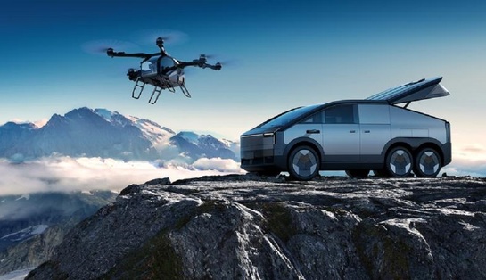 «Летающий автомобиль» представляет собой шестиколесное наземное транспортное средство с возможностью крепления съемного электрического летательного аппарата вертикального взлета и посадки.