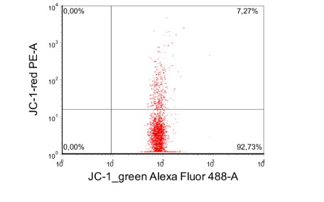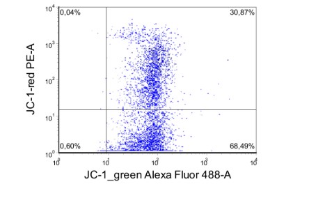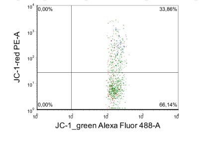 Таким образом, на основании оценки количества JC-1green+ (мономеры) и JC1red+ (агрегаты) клеток можно говорить о состоянии мембраны митохондрий в изучаемом пуле клеток, а преобладание JC1red+ (агрегаты) клеток будет косвенно указывать на активацию митохондрий.