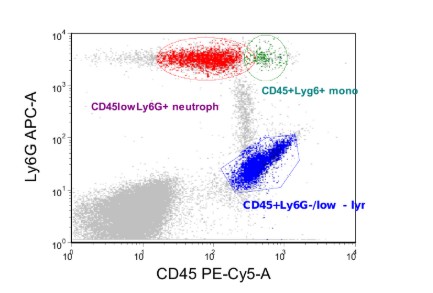 При анализе экспрессии флуоресцентных красителей, отражающих активность мембраны митохондрий через один час и через три часа после введения препарата мышам, достаточно отчетливо выявлялся наблюдаемый у большей части особей сдвиг плотности экспрессии в сторону красного спектра, т.е. появление популяции агрегатов, что свидетельствовало о начальных этапах активации митохондрий. Наиболее отчетливо эта тенденция проявилась на нейтрофилах и моноцитах крови.
